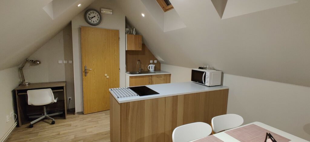 Dvě ložnice se třemi lůžky + dvě samostatná lůžka ve výklenku. Prostorné apartmá s 1 obývacím pokojem, 2 oddělenými ložnicemi, 1 koupelnou se sprchou a toaletními potřebami zdarma, kuchyňským koutem s lednicí, nádobím a mikrovlnnou troubou, koberci, posezením se satelitní TV s plochou obrazovkou, příslušenstvím pro přípravu čaje a kávy, šatní skříní a vytápěním. V … Pokračování textu Podkrovní apartmán pro 8 osob.
